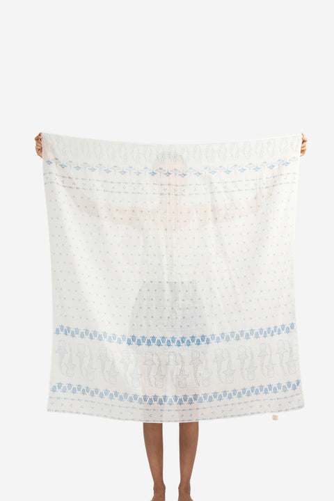 A cool, clean white scarf that reflects the serene underwater mosaic of fish life. An ideal accessory for everyday elegance and comfort.