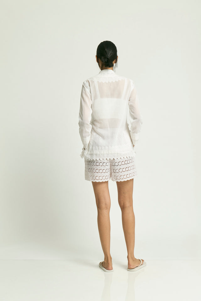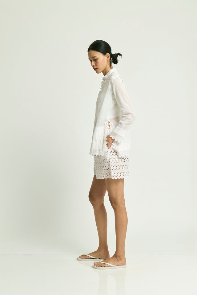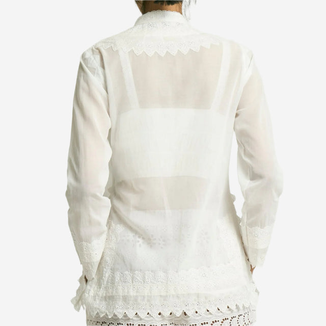 Inspired by the kebaya style worn by Dutch women during the colonial time. Made with the finest cotton, high collar, decorated with appliqué and lace trim along the hems and sleeves.