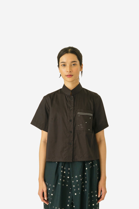 A cool and breezy black shirt featuring a Betawi-style high collar, embellished with an embroidered pocket and a hand-drawn patch of Tulus on the back. Perfect for any occasion, day or night.