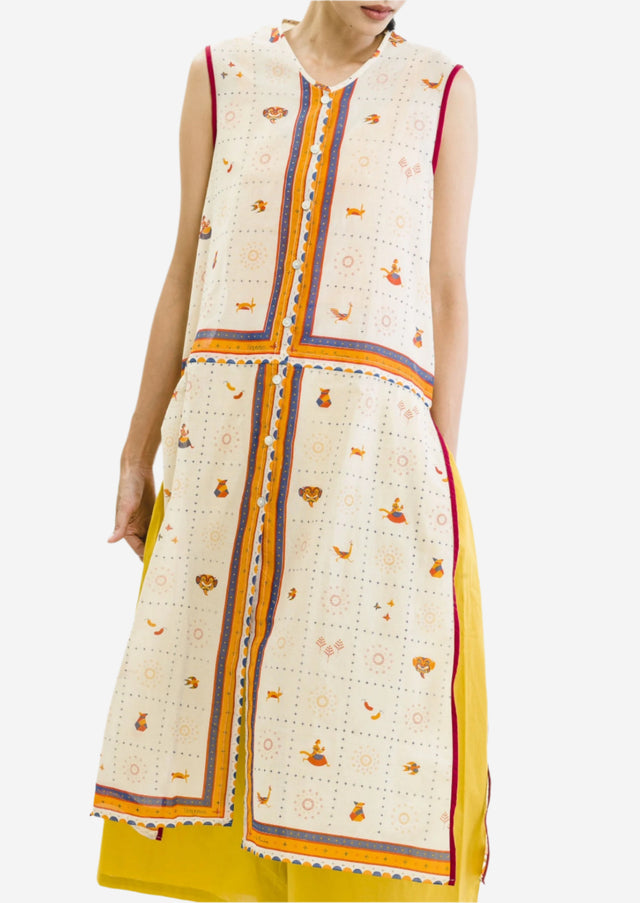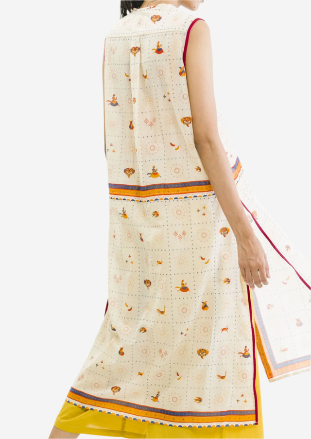 Casual comfort sleeveless mid-length dress, slits on both sides, O-neck. It showcases characters from the children's book “Timun Mas,” making it a meaningful addition to your wardrobe.