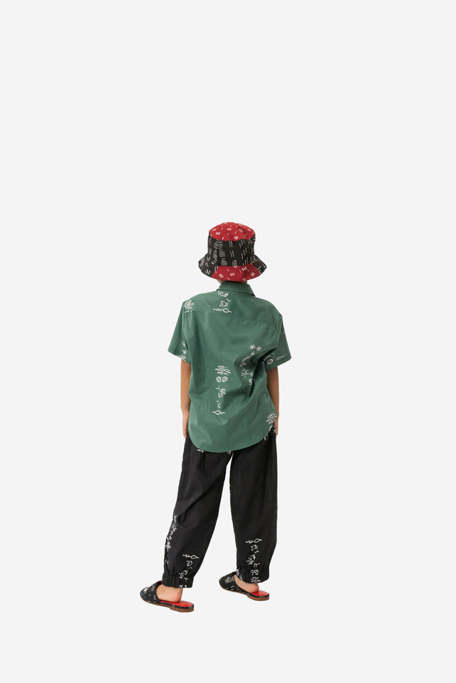 Looking cool and handsome with this hand Stamped batik artfully composed on this fashionable green shirt